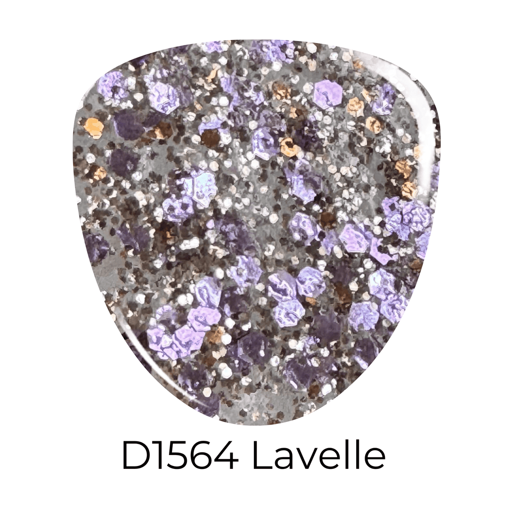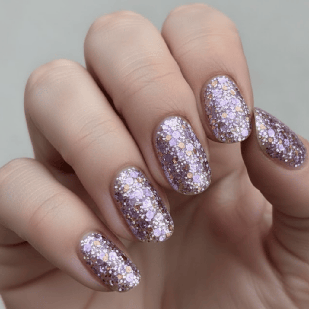 Lavelle is a clear base with large pink and copper glitters that feel like opening a jewelry box full of romantic sparkle.  It has a luxurious, statement making finish and is perfect for a bold yet feminine look.