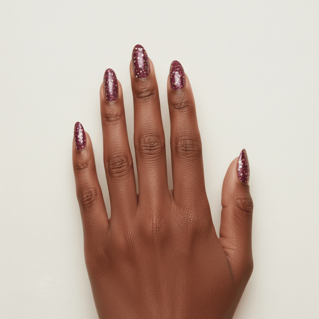 Masquerade is a wine color with medium sized multiple colored glitters.