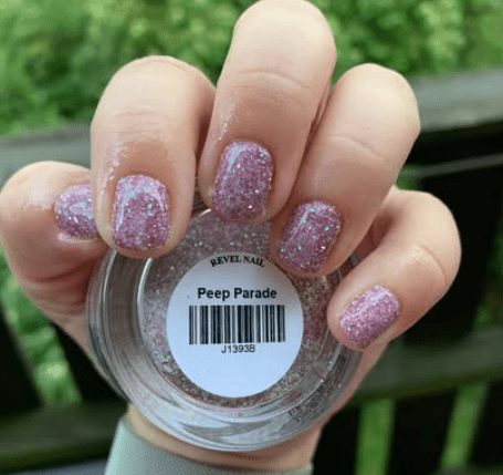 D1393 Peep Parade is a glitter shade with pink and gold glitters accented with iridescent glitters that shine aqua and green.