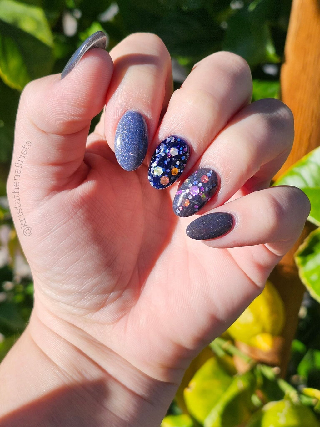 • D1596 Frosty Fireworks is a dark blue with larger multi-colored glitters that resemble fireworks suspended in a frosty blue sky.
