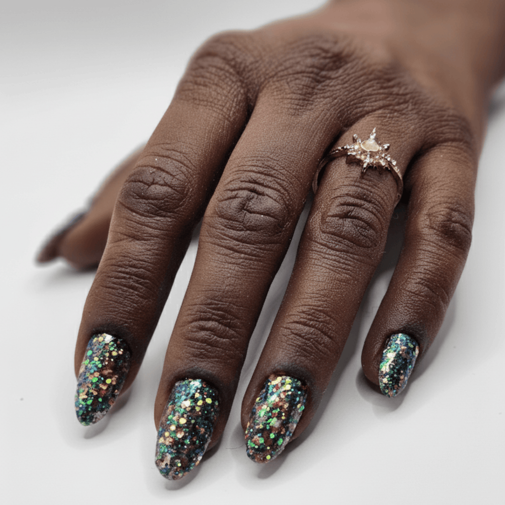 Plume is a glitter/flake that bursts with color blending a kaleidoscope of greens, yellows, orange and blues that create a bold, playful full mani or accent nail.