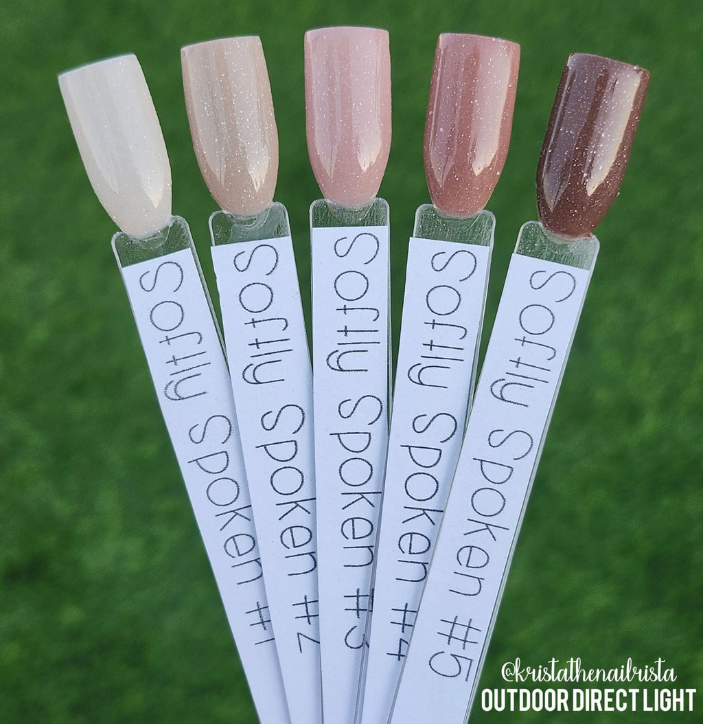 Softly Spoken is a 5 color tonal set designed to evoke calm elegance and understated beauty. Each color carries a soft glitter that is subtle and just enough to catch the light.