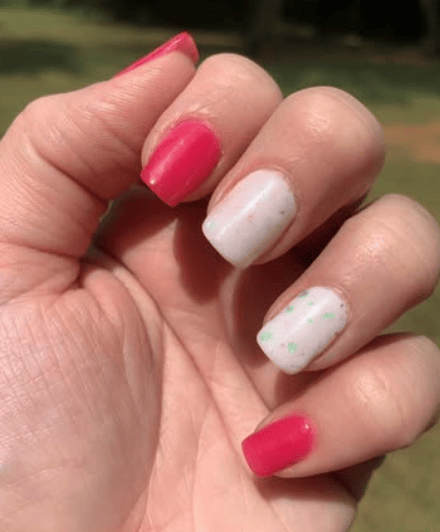 Morning Dew has an opaque white base with pink and green flakes.