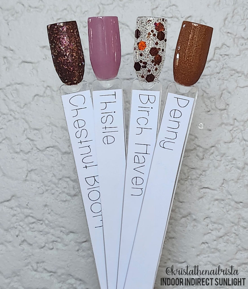 -Birch Haven is a multi-faceted confetti shade featuring a sheer base generously sprinkled with a mix of brown, copper, and bronze metallic glitters in various sizes. Can be used as an overlay also!