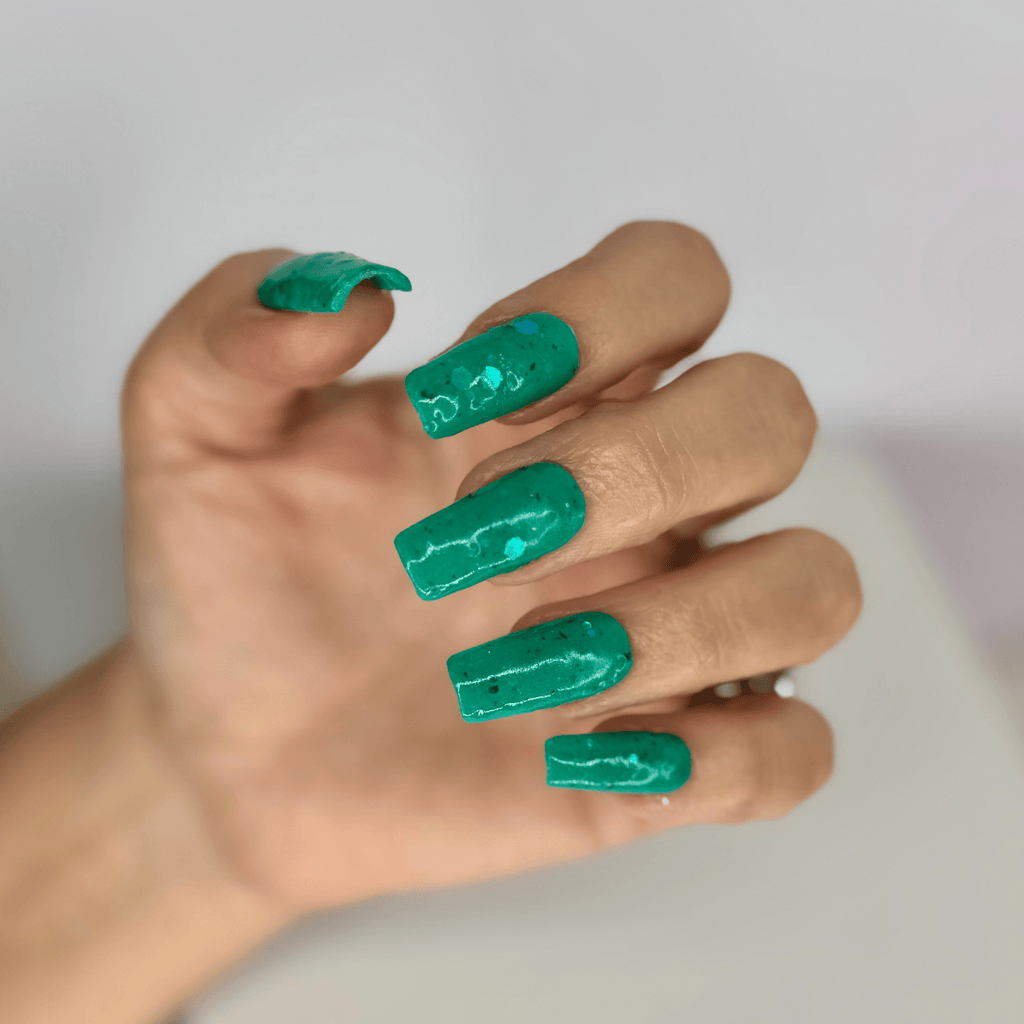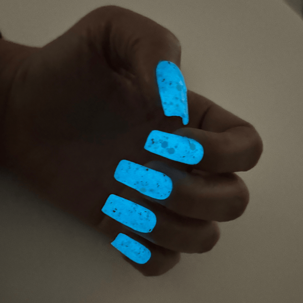 Lunar Lagoon is a green teal with multiple glitters and flakes and it glows blue in the dark after exposed to sunlight!