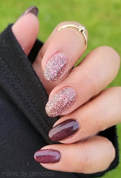 Affair is a fine black and pink glitter with chunky and fine rose gold glitter.