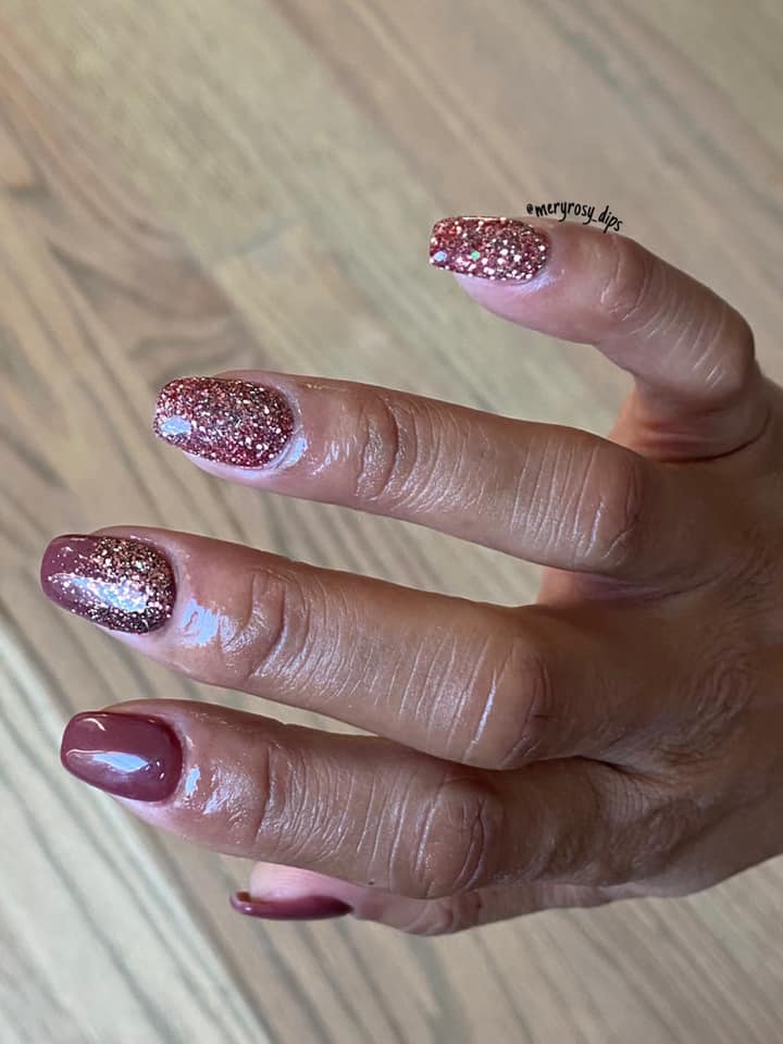 Affair can be paired with D233 Runway. Although not a chunky glitter we still recommend finishing the dip powder manicure by adding a layer of D75 Vivien (Clear).