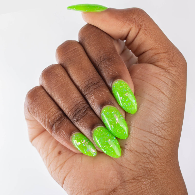 Bright, bold and shockingly green, Get Slimed is THE shade to wear to get noticed. This warm weather favorite is mixed with iridescent flakes making it a unique and must own neon shade.